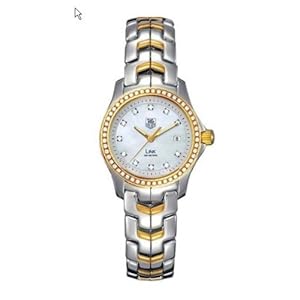 Make a bold, fashionable statement statement with this two-tone TAG Heuer Link timepiece for women (model WJF1354.BB0581), which offers glittering diamond accents. The stainless steel watch case measures 27mm wide (1.06 inches) and is topped by a gold-tone bezel that is completely ringed with 52 sparkling, tiny Wesselton diamonds. The mother-of-pearl dial is further accented with 11 more diamonds as well as luminous baton hands (with seconds hand) and a date window at 3 o'clock. It's matched to a stainless steel bracelet band composed of satin-finished S-shaped links. Other features include a precise Swiss quartz movement, highly scratch-resistant sapphire crystal, and water resistance to 200 meters (660 feet)--suitable for recreational scuba diving.