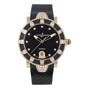 Diamonds are a girl's best friend, both above water and below, especially when they adorn the bezel of the Women's Marine Diver Watch from Ulysse. You'll be the belle of the coral reef with this beauty on your wrist. Glittering with diamonds, this timepiece boasts a striking black dial adorned with diamond hour markers and a date window at the six o'clock position. Don't let its loveliness fool you: this watch is tough too. It has a power reserve of 42 hours, and it is water resistant to 330 feet. An anti-reflective sapphire crystal protects the watchworks, as does a rose-gold case that contrasts beautifully with the black dial.